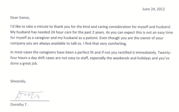 I just wanted to thank you and your staff for all of your assistance over the past few months. The care and compassion routinely demonstrated by your Nurses and Home Health Aides was greatly appreciated. In addition, the fact that I could always reach out to you, the owner, with any questions or problems was a tremendous help and something a customer at a larger agency could probably not depend upon.